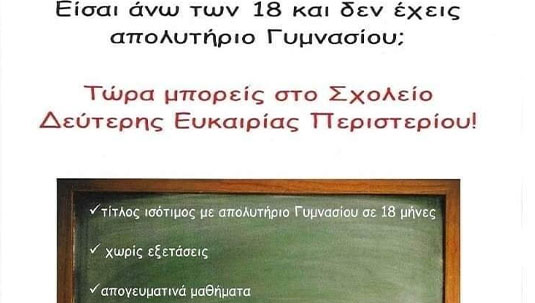 Τελευταίες ημέρες εγγραφών (μέχρι Τρίτη 11 Οκτωβρίου) στο ΣΧΟΛΕΙΟ ΔΕΥΤΕΡΗΣ ΕΥΚΑΙΡΙΑΣ (Σ.Δ.Ε.) ΠΕΡΙΣΤΕΡΙΟΥ.