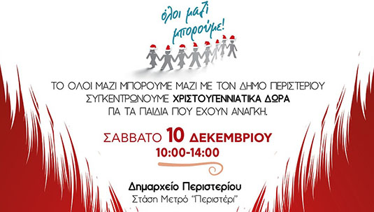 Την Παρασκευή 16 Δεκεμβρίου, από τις 8:00 έως τις 20:00, σε συνεργασία με το Δήμος Περιστερίου, συγκεντρώνουμε κουτιά με γάλα και φτιάχνουμε μαζί, το ομορφότερο χριστουγεννιάτικο δέντρο