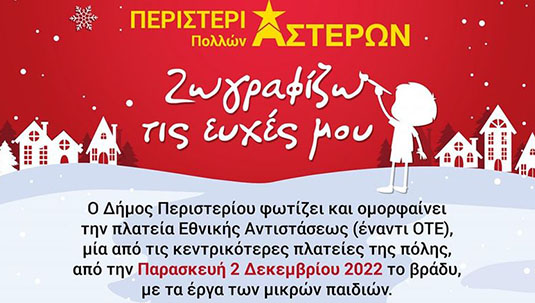 Ο Δήμος Περιστερίου φωτίζει και ομορφαίνει την πλατεία Εθνικής Αντιστάσεως (έναντι ΟΤΕ), μία από τις κεντρικότερες πλατείες της πόλης, από την Παρασκευή 2 Δεκεμβρίου 2022 το βράδυ, με τα έργα των μικρών ζωγράφων.