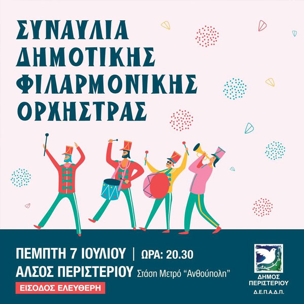 Συναυλία Δημοτικής Φιλαρμονικής Ορχήστρας Σήμερα Πέμπτη 7 Ιουλίου, ώρα 20:30, Άλσος Περιστερίου. Είσοδος ελεύθερη! Σας περιμένουμε! Ελάτε μικροί και μεγάλοι να απολαύσετε την συναυλία δημοτικης φιλαρμονικής ορχήστρας.